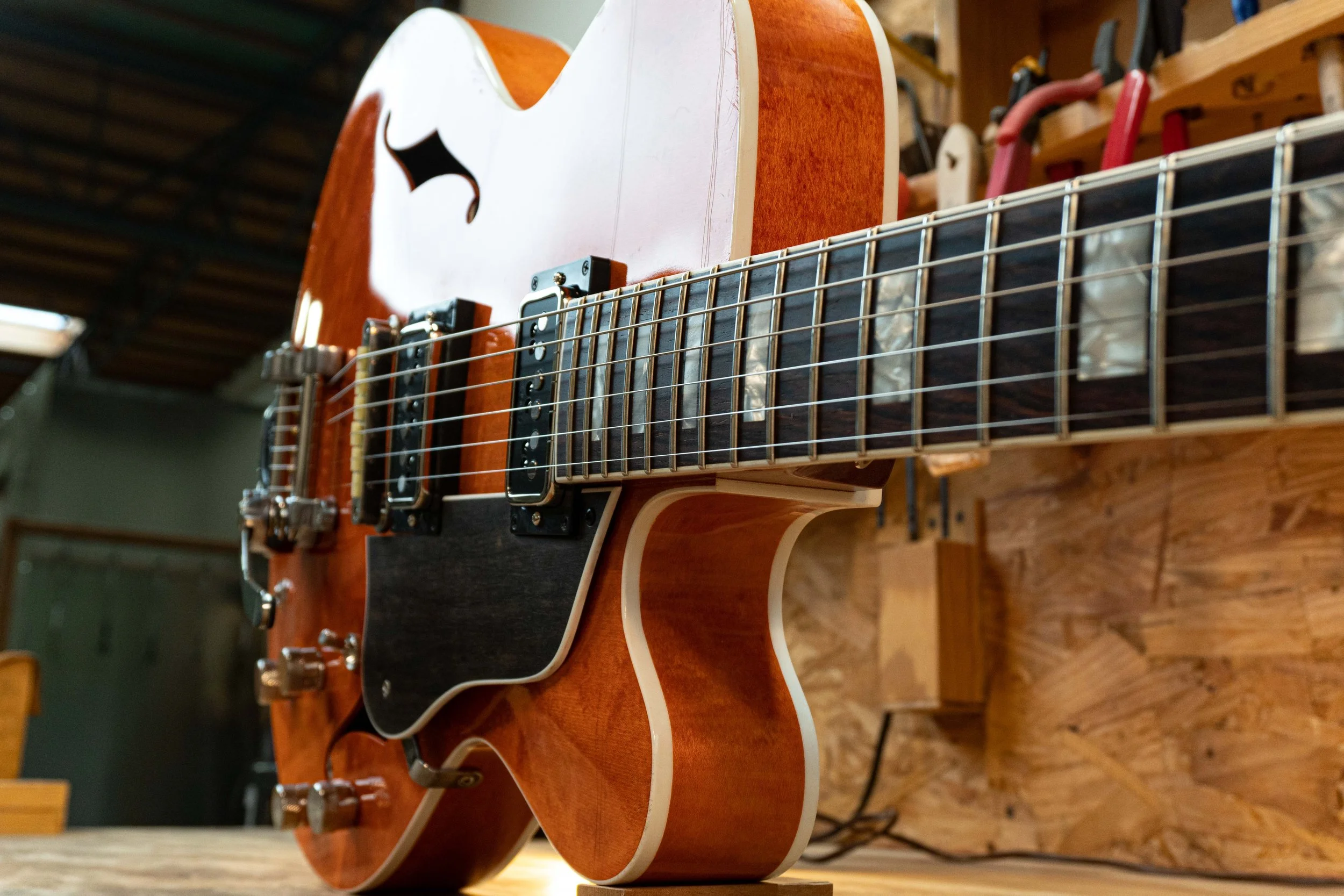 Inspired from our Mockingbird Model, now in a single cut version! Available in 2 different body depths and many build options, bringing a large array of tone capabilities. A true semi-hollow body construction, with laminated pressed Top/Back/Sides. Features a 16” lower bout, Mahogany neck, and binding throughout. Available in 4 different neck thicknesses to achieve that perfect neck size you’re looking for. Many available options for you to select from.